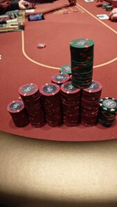 Turn: ruter ess ger mig nästnötfärg, men samtidigt hoppar hjärtat upp i halsgropen. Jag hinner tänka att om jag förlorar den här potten finns det en liten risk att jag kräks över bordet, kliver ut i lobbyn och säger åt första bästa taxi att köra mig till flygplatsen…