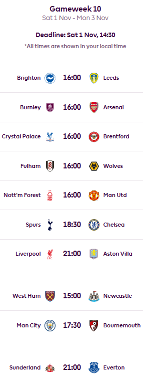 Brighton bjuder ner Leeds till sydkusten för en drabbning på Amex Stadium. Brighton väntar fortfarande på sin första nolla och kanske kommer den nu, Leeds är dock inga man bara kör över så det kommer krävas en gedigen insats av hemmalaget om man vill inkassera 3 pinnar här. Burnley kommer samtidigt få möjlighet att testa sin “stå lågt och kontra” taktik på den tuffaste svårighetsgraden. Tills Arsenal får in en boll förväntas en ockupering av Burnleys straffområde, minst ett hörnmål förutspås.