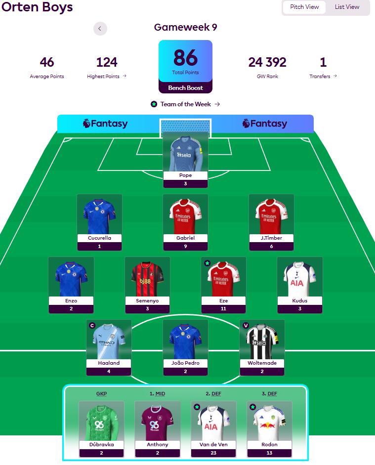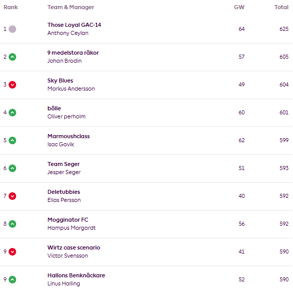Anthony Ceylan gjorde denna veckan ett litet ryck i toppen efter att ha inkasserat 64 poäng i en jämförelsevis anonym omgång. Omgångens prestation hittar vi hos Fredrik Sjögren som med “Orten Boys” spelade in hela 86 poäng efter en bench boost som såg honom ta hem ytterligare 40 poäng från i huvudsak Van der ven och Rodon, snyggt jobbat!