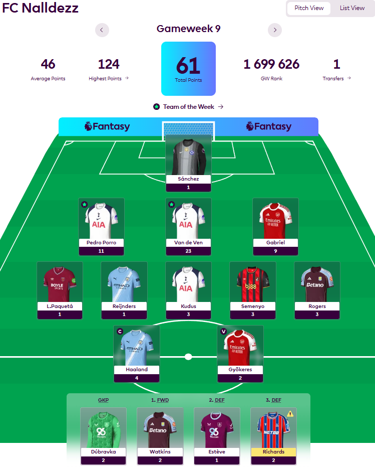 Med 1 match kvar att spela var känslan dyster och en röd pil kändes trolig. Laget hade förutom den nyvärvade Gabriel misslyckats att prestera vilket gjorde berget att bestiga ännu högre för de 3 som skulle avsluta omgången för oss. Tror att Tottenham inför matchen måste ha tittat på klipp från sina rivaler i norra London och inspireras för när halvtid var ett faktum studsade man på moln hemma i studentrummet. 2 hörnmål av Van der Ven, assist av Porro och en nolla som fortfarande levde, nyp mig i armen för jag måste drömma 😍. När slutvislan sen ljöd kunde man totalt inkassera 37 poäng från sina 3 spelare och istället för en tydlig röd pil var alla siffrorna så gröna de kunde bli.