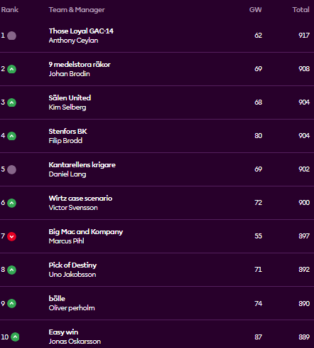 I stugan-ligan blir det allt tightare efter ytterligare en vecka av tappade poäng från Anthony Ceylan, han gjorde likt undertecknat misstaget att gå emot Haaland med bindeln. Hans buffert räckte dock återigen och han behåller topp-platsen även inför denna omgång. Veckans prestation hittar vi hos Björn Johansson med “Norrlands Guld” (ej sponsrat 😅) som kammade hem imponerande 97 poäng, mycket tack vare kombon Guehi – Munoz, snyggt jobbat.