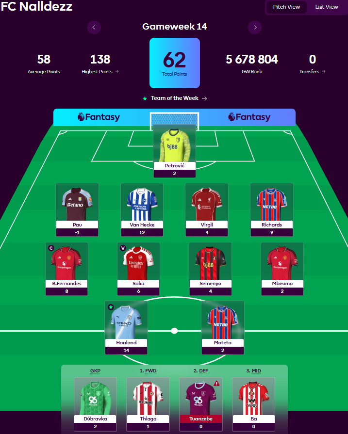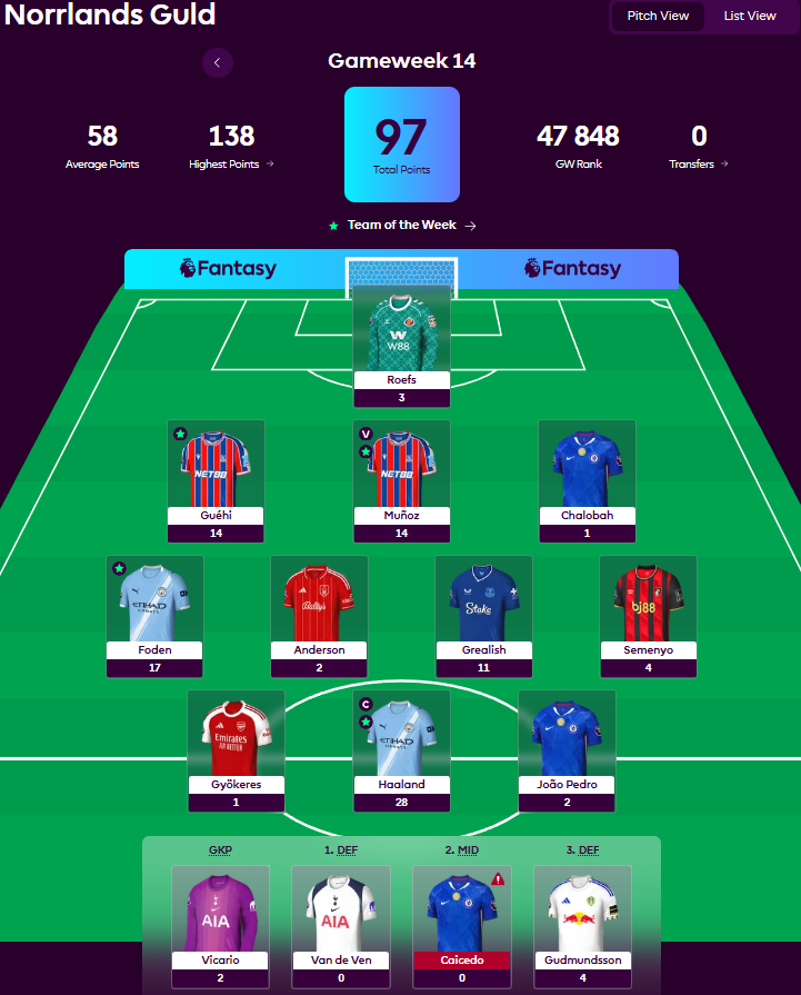 Inför kommande omgång har Semenyo redan lämnat plats åt Minteh och om inget oförutsett sker kommer även Petrovic och Pau Torres lämna plats mot Allison/Leno och Andersen. Kaptensbindeln landar denna omgång på Haaland, även om jag tror att Bruno skulle kunna hota, och laget ser riktigt starkt ut inför vad som väntar i helgen.