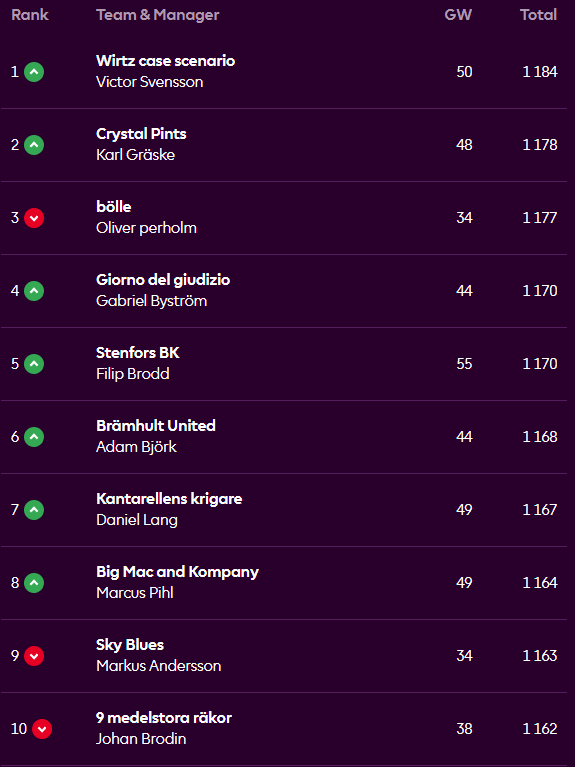 De fortsätter att skiftas om i tabelltoppen och vi har för tillfället Victor Svensson tillbaka i förarsätet, tätt följt av Karl Gräske och Oliver Perholm. Det känns som det kommer vara ett tight race hela vägen in i mål och det ska bli oerhört spännande att följa. Veckans prestation hittar vi hos Linus Halling med “Hallons Benknäckare” som spelade in hela 83 poäng i en annars väldigt blygsam vecka, snyggt jobbat!