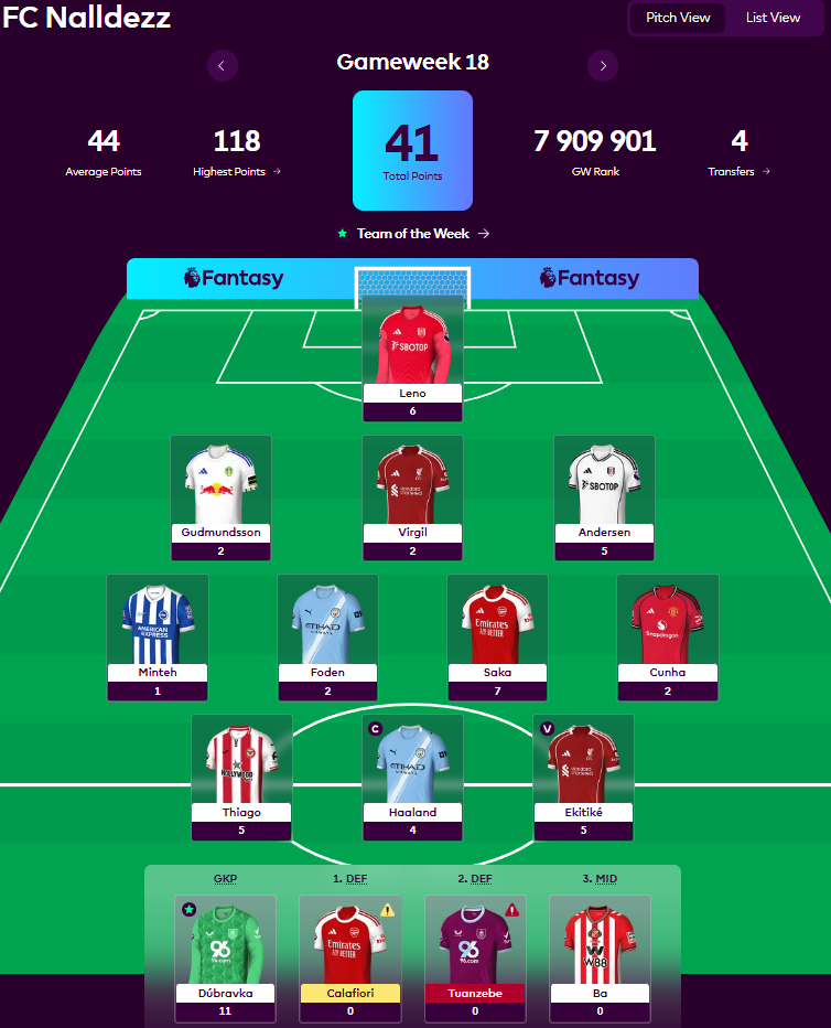 Hos undertecknad var det återigen en dyster vecka när ytterligare röda pilar var ett faktum och vi har nu hamnat utanför topp 1 miljon 😔. Fulham levererade återigen och vi fick denna vecka även lite smågodis från Ekitike, Thiago och Saka med en assist var. I övrigt var det tyst och i och med mycket poäng för andra relativt populära spelare så var det inte tillräckligt. Många små marginaler som var emot när Thiagos mål blev registrerat som självmål utan assist, Minteh kom riktigt nära men blev stoppad av en superräddning från Raya och Andersen missade defcon precis samt tog gult kort som annars hade kunnat varit en 10-poängare.