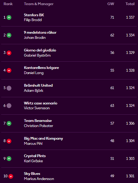 Ny omgång och ett nytt lag i toppen av tabellen, känns som den nya regeln numera. Efter den senaste omgången har vi nu Filip Brodd med “Stenfors BK” i topp. Veckans prestation hittar vi hos Johan Berg med “Desporterna” som kammade hem 81 poäng, snyggt jobbat!