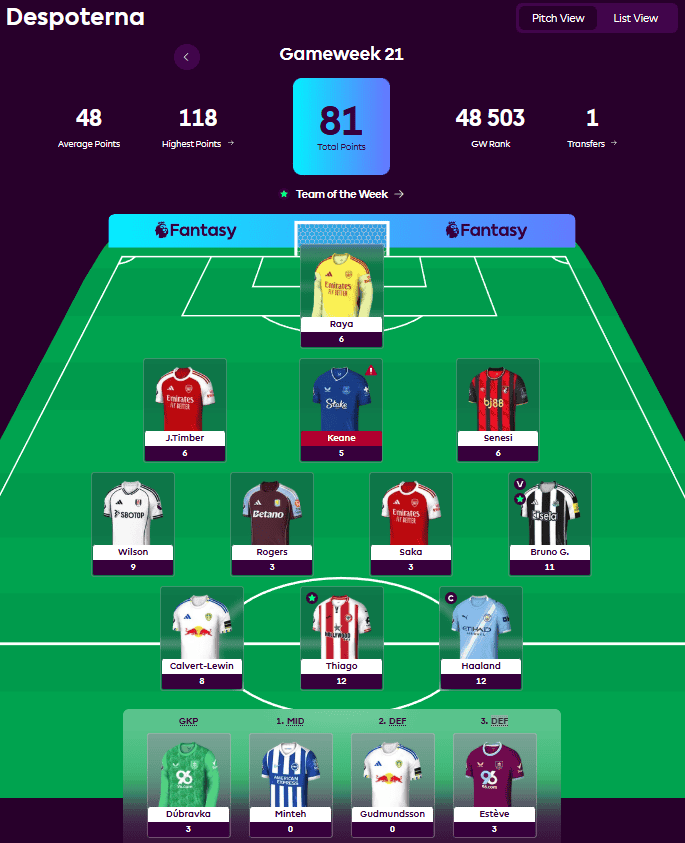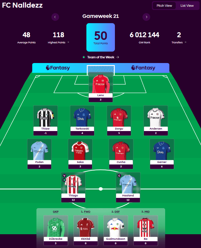 För egen del blev man återigen räddad av Thiago, även om det inte riktigt räckte hela vägen till en grön pil denna gång. Många små marginaler som var emot oss när bland annat Everton släpper in mot Wolves och mitt dubbla Fulham-försvar har guldläge mot Chelsea bara för att släppa in mot 10 man. Inför nästkommande omgång ser det lite skakigt ut men förhoppningsvis kommer det lösa sig inom de närmsta veckorna om jag får göra de byten jag planerat.