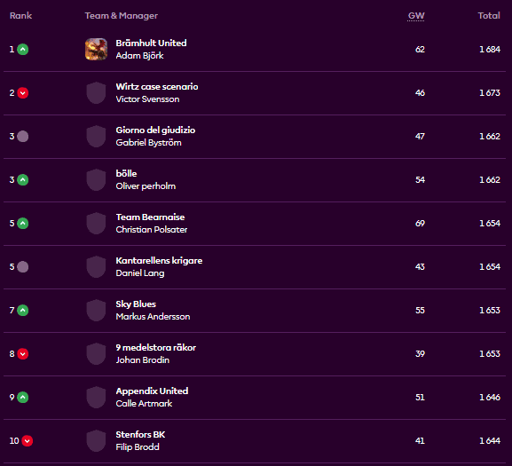Stuganligan toppas efter omgång 27 av Adam Björk med “Brämhult United”. Vi kommer säkerligen se fortsatta skiften på tronen hela vägen in i mål, frågan är om det blir en sen spurt eller någon som legat med i topp hela säsongen? Veckans prestation hittar vi denna vecka långt ner i tabellen hos Niclas Backlund med “Guldkustens FC”. Ser ut att vara ett ghostship vilket visar på hur komiskt FPL kan vara ibland.