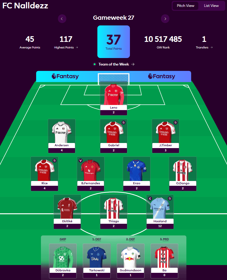 För tredje veckan i rad så synar vi den röda pilen, och denna vecka var nog den tuffaste. Fulham och Arsenal släpper båda in ett mål i matcher de är överlägsna i, där Fulhams var på straff. Vi tar sen in Dango som tillsammans med Thiago har högsta xgi i deras match, men där båda blankar. Ekitike lämnar också med blank trots 0.71 xg. Nej, det är mycket som går emot just nu, men laget ser som jag tidigare sagt fortsatt starkt ut.