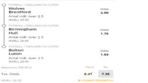 Över 2.5 mål i samtliga matcher (Wolves – Brentford, Bolton – Luton, Birmingham – Hull) @ 7.35