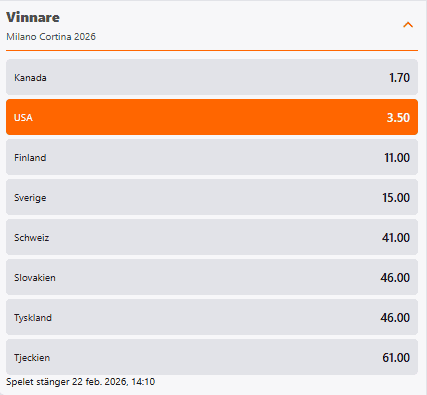 Vi börjar med att följa upp gårdagens spel som Timman skrev om. Slutsatsen kvarstår: USA att vinna guld är fortfarande ett fint spel, trots att oddset har börjat droppa på flera håll. Vi får dock fortfarande 3.50 hos Betsson, vilket plockas! Ikväll väntar Tre Kronor för jänkarna, och knappast någon har missat hur Sveriges väg till en potentiell final blev betydligt tuffare efter det sena insläppta målet mot Slovakien i den sista gruppspelsmatchen. I förrgår publicerade jag även texten om vad som faktiskt gick fel – ”Misstaget som kostade Sverige” – för er som vill ta del av mina tankar kring uppståndelsen och det feltänk som präglade både journalistkår och ledarstab.
