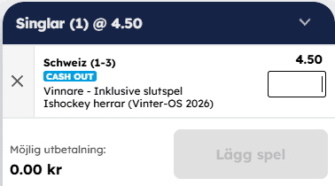 Avslutningsvis har vi Schweiz att ta medalj. Korrekt odds ligger runt 4,31, men det finns 4,50 att hitta hos flera spelbolag. Jag väljer att spela den via 1X2.se. Schweiz måste först ta sig förbi Finland ikväll – en tuff uppgift, men Patrick Fischer och hans manskap har stått upp väl mot starkt motstånd tidigare. Sett till helheten är Schweiz kanske det lag som imponerat mest bakom de mest NHL-tunga nationerna. Inte minst har Meier varit lysande och ligger tvåa i OS poängliga bakom Connor McDavid, vilket tydligt visar att kvaliteten finns i truppen.