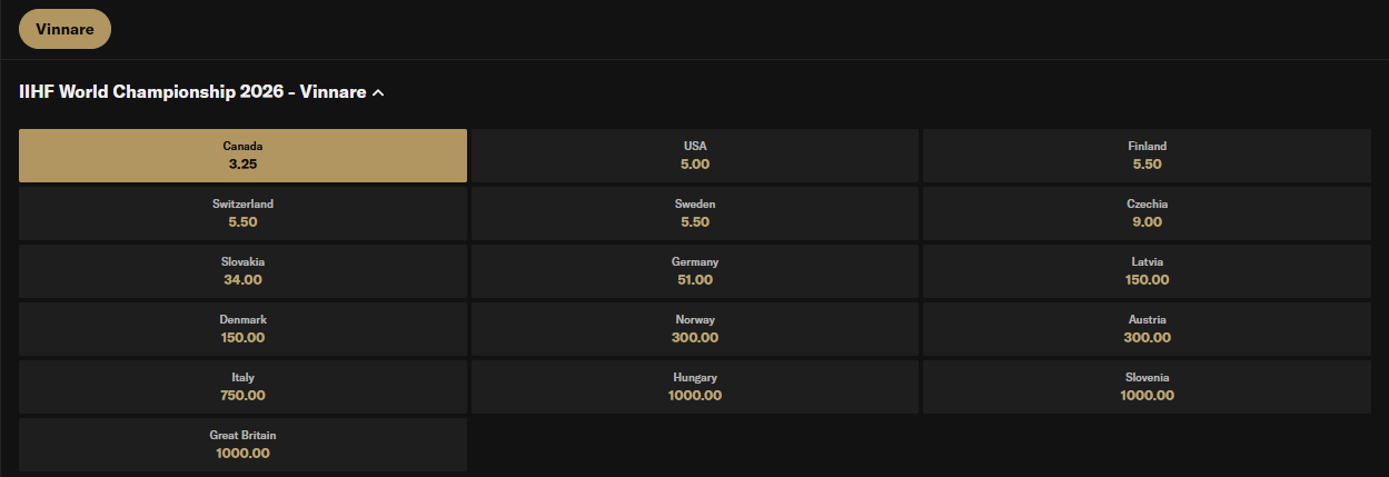 Jag tycker att det mesta pekar mot Kanada som VM-vinnare i Schweiz, och oddset går just nu att hitta till 3.25. Det har droppat en del under dagen efter nyheten om bland annat Celebrini, men jag tycker fortfarande att det finns tillräckligt med uppsida för att kliva på spelet till nuvarande prissättning.