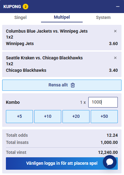 Chicago har på slutet varit ute på tuffa bortamatcher mot New York Islanders, Philadelphia Flyers och New Jersey Devils – och stängt lägre i odds än de står i här. Samtliga dessa lag håller högre nivå än Seattle Kraken. Oddset på gästerna är helt enkelt för högt om inget oförutsett sker inför nedsläpp, och 3.40 mumsar jag gladeligen i mig!