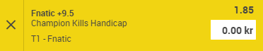 Mitt spel i matchen blir Fnatic +9.5 kills till oddset 1.85 hos MrGreen