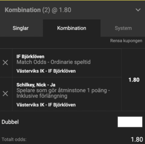 Nick Schilkey att göra poäng får agera oddsboost här i spelbyggaren hos Unibet, mycket på grund av kanadensarens fina form på slutet, och inte minst mot just Västervik historiskt. Således blir spelet Björklöven att vinna efter fulltid + Nick Schilkey att göra poäng mitt första spel här på TGC. Nu kör vi!